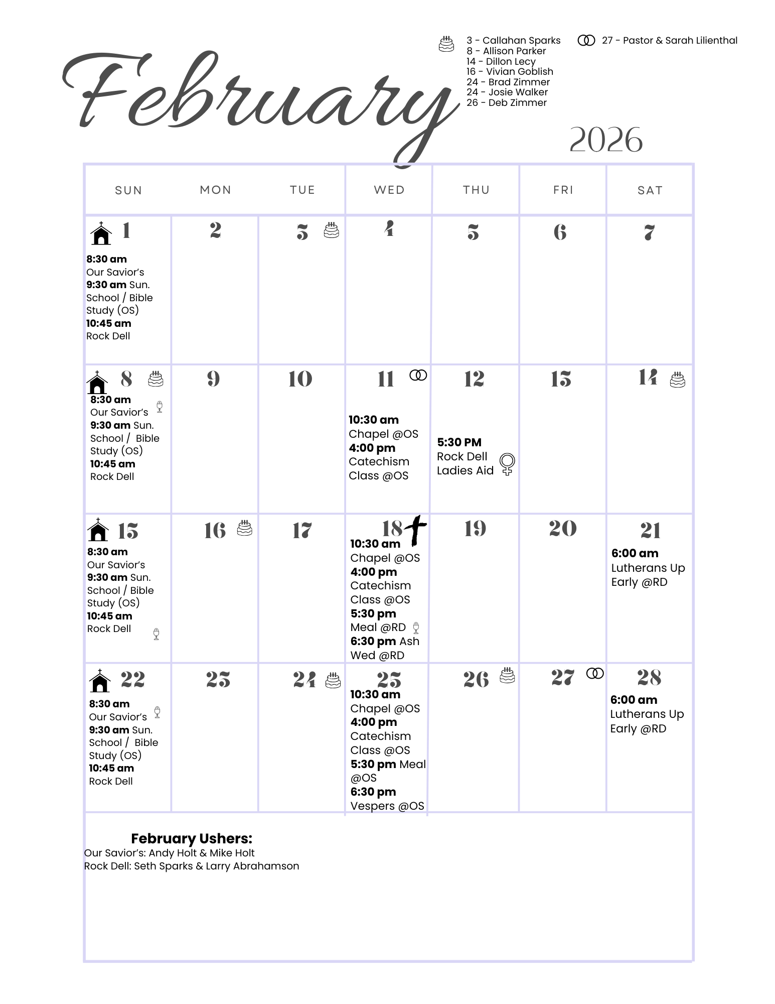 Sunday School 9:30 am (Sept.-Dec. at Rock Dell | Jan.-May at Our Savior’s)